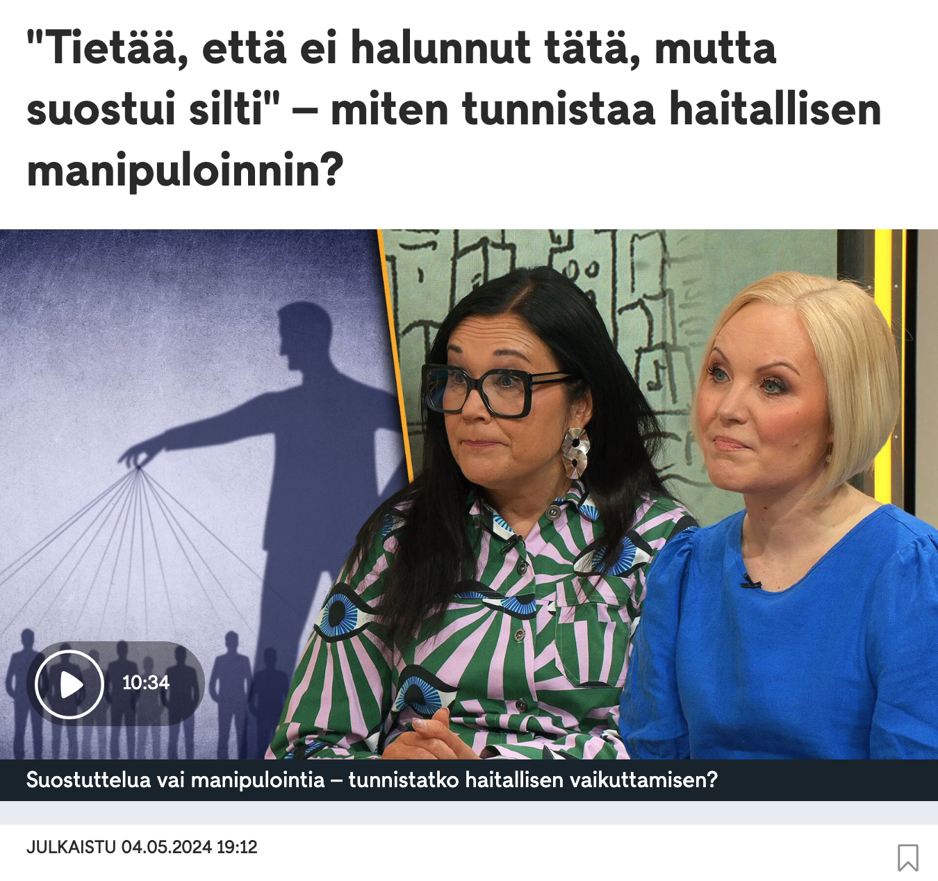 Kun ihminen suostuu johonkin haluamattaan, on usein kyse manipulaatiosta. Miksi niin käy ja millaisia tehokeinoja manipuloija silloin käyttää? Haitallisen vaikuttamisen tunnistamisesta ja rajojen asettamisesta on hyötyä niin ihmissuhteissa kuin työpaikoilla ja sosiaalisessa mediassakin.